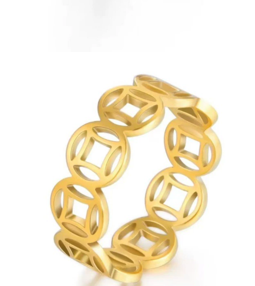 钛钢饰品镂空招财铜钱转运食指钛钢戒指几何个性复古情侣戒
