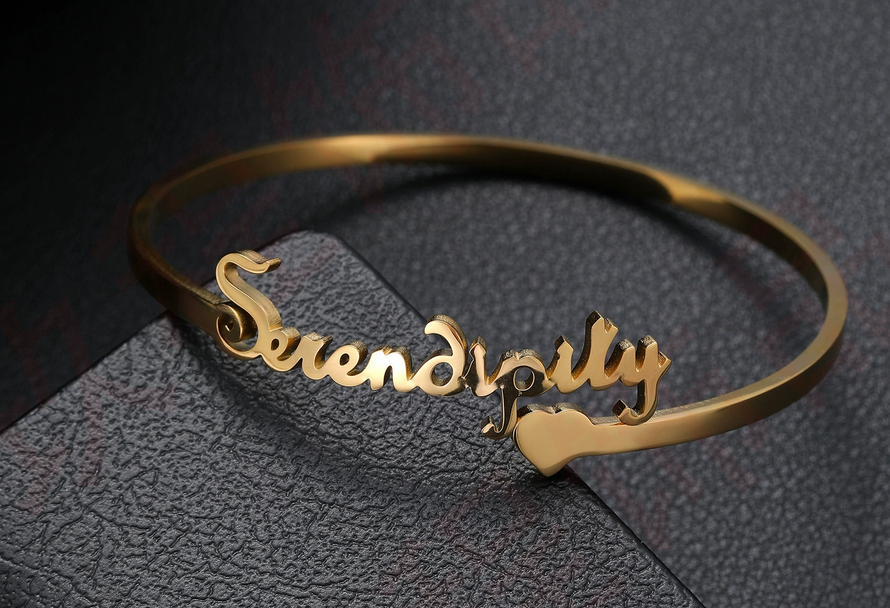 时尚不锈钢3mm爱心圆形名字手镯电镀18K金字母手镯
