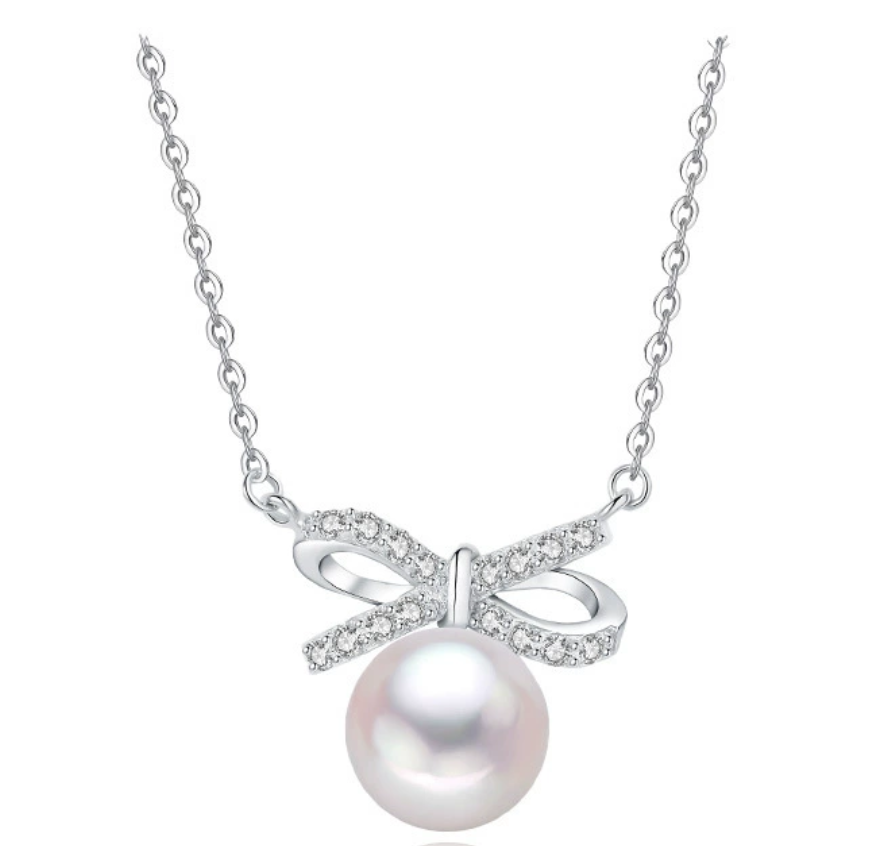 925纯银项链女银色蝴蝶结淡水珍珠锁骨链小清新森系项饰