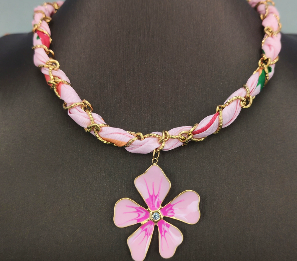 彩色太阳花项链小清新格子花纹丝巾气质优雅吊坠钛钢项链